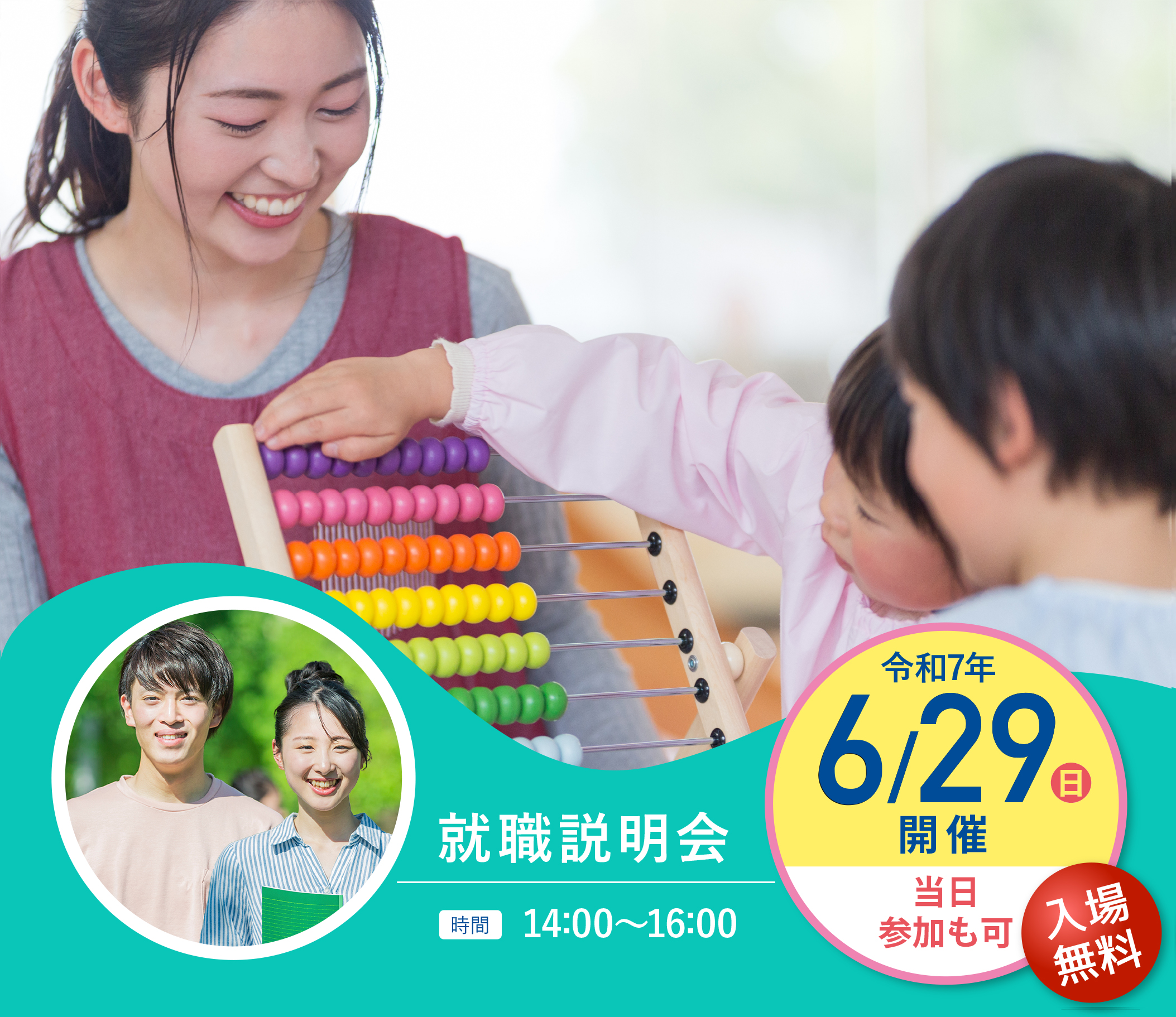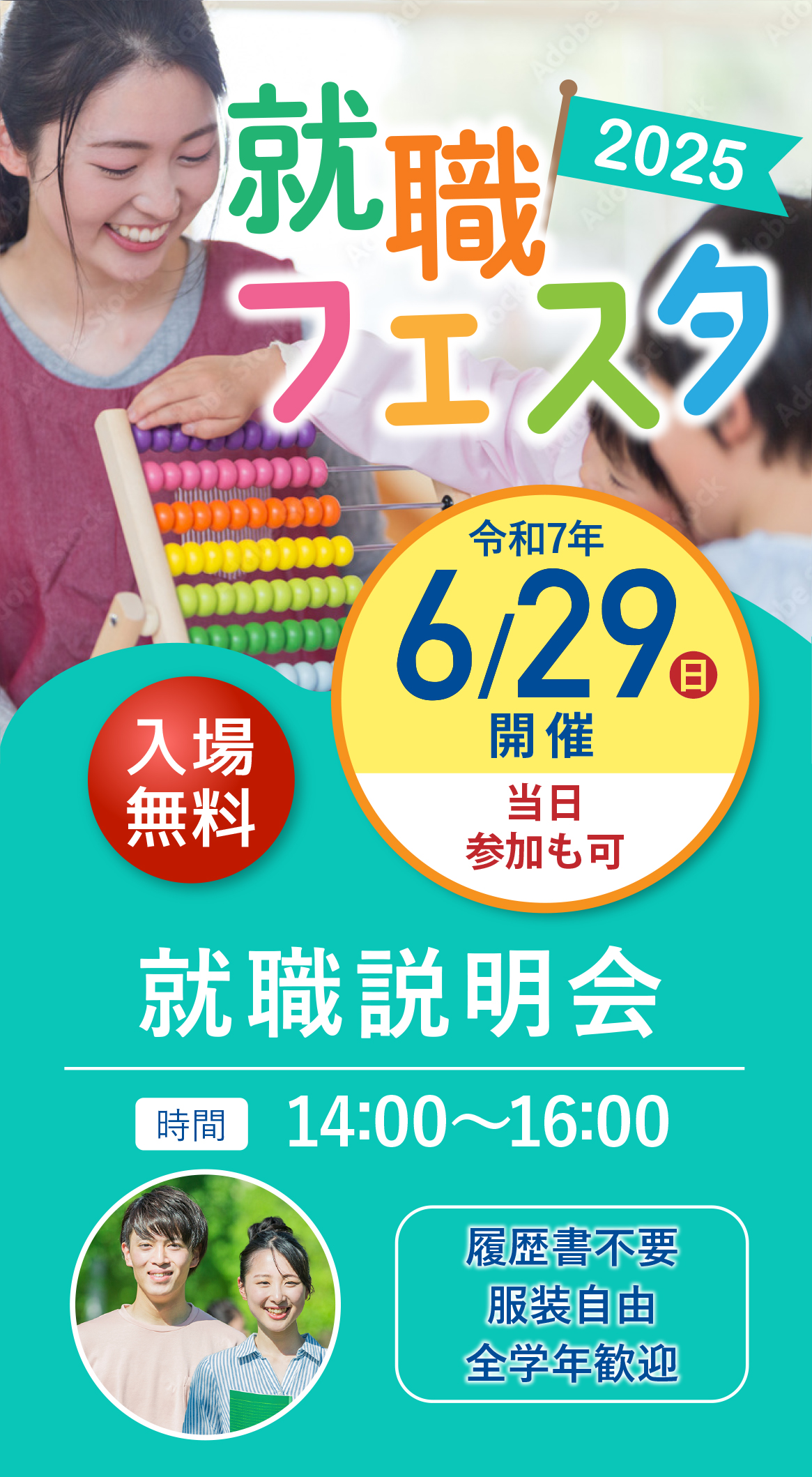 | 参加対象 | ●学生(大学生・短大生・専門学校生) ●幼稚園に就職希望の方 >幼稚園・認定こども園 ●幼稚園の仕事に興味のある方 >幼稚園・認定こども園 |